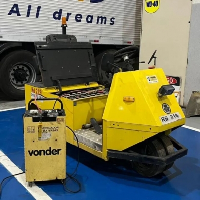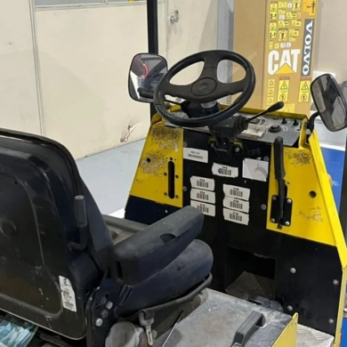 Trator rebocador amarelo ideal para movimentação de cargas em ambientes industriais e comerciais. Design robusto e eficiente para facilitar suas operações.